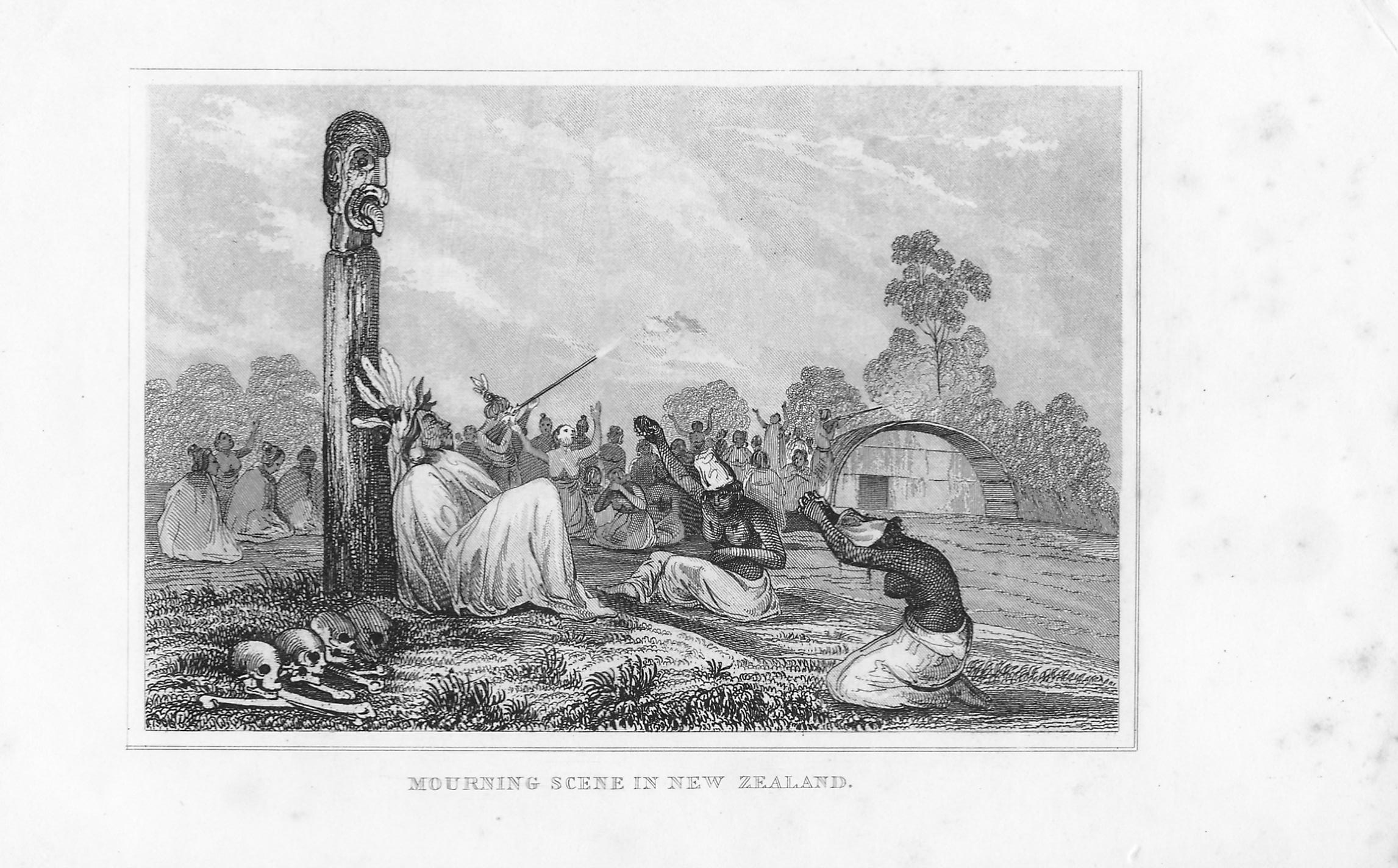 - Mourning Scene in New Zealand, engraved plate, image 9 x 14 cm [3.5